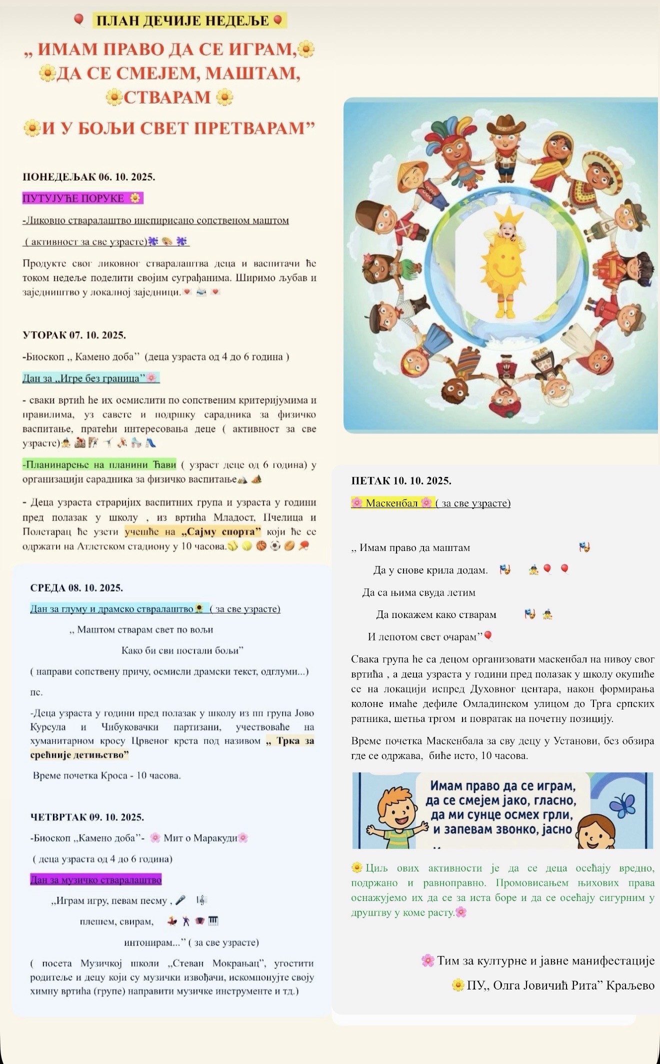 Дечија недеља ће и ове године у насој Установи бити обележена на начин који инспирише децу да промишљају о својим правима и обавезама у друштву у коме одрастају.